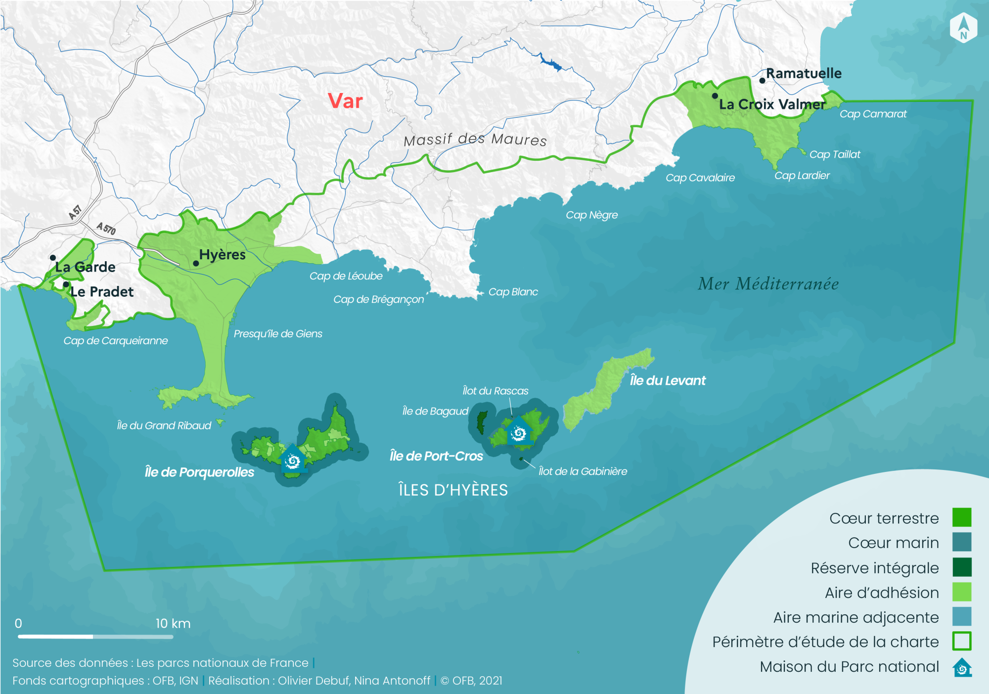 Premier parc marin créé en Europe, le Parc national de Port-Cros est constitué de l’île de Port-Cros et des espaces naturels propriétés de l’État, de l’île de Porquerolles (pour la partie coeur) et de cinq communes signataires de la charte : La Garde, Le Pradet, Hyères-les-Palmiers, La Croix-Valmer et Ramatuelle (pour l’aire d’adhésion).